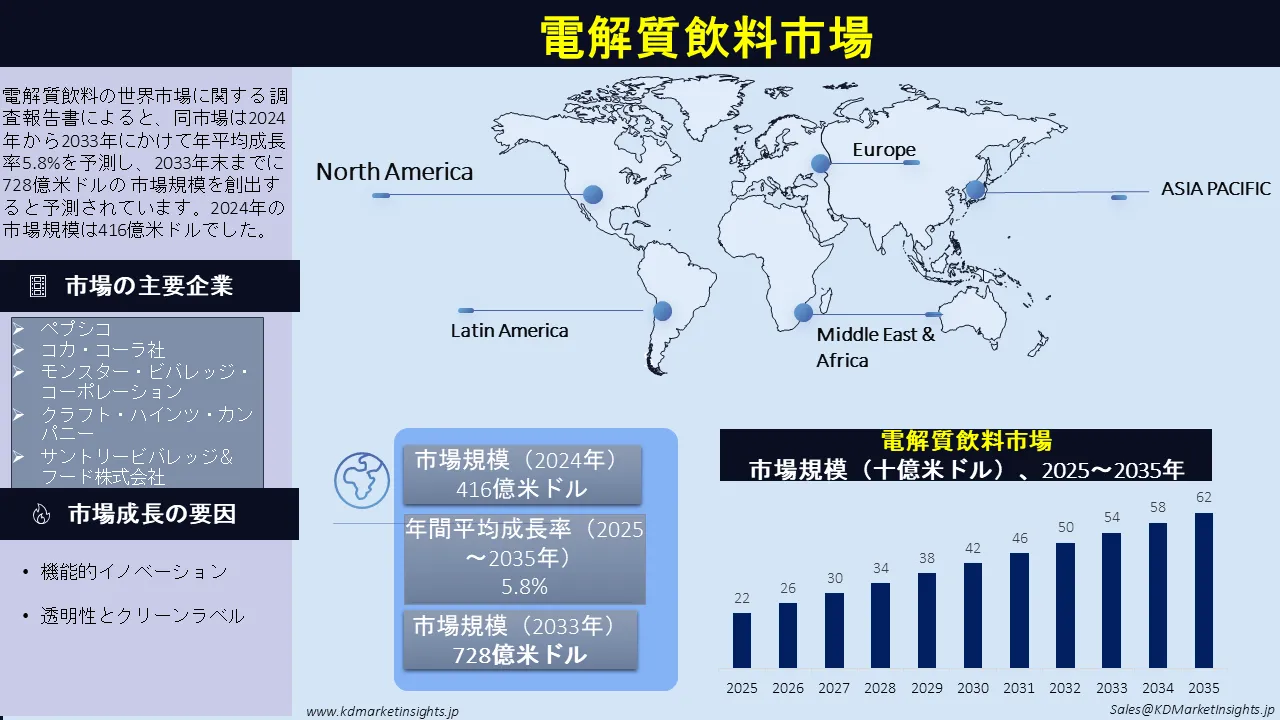 電解質飲料の世界市場に関する 調査報告書によると、同市場は2024年から2033年にかけて年平均成長率5.8%を予測し、2033年末までに728億米ドルの 市場規模を創出すると予測されています。2024年の市場規模は416億米ドルでした。